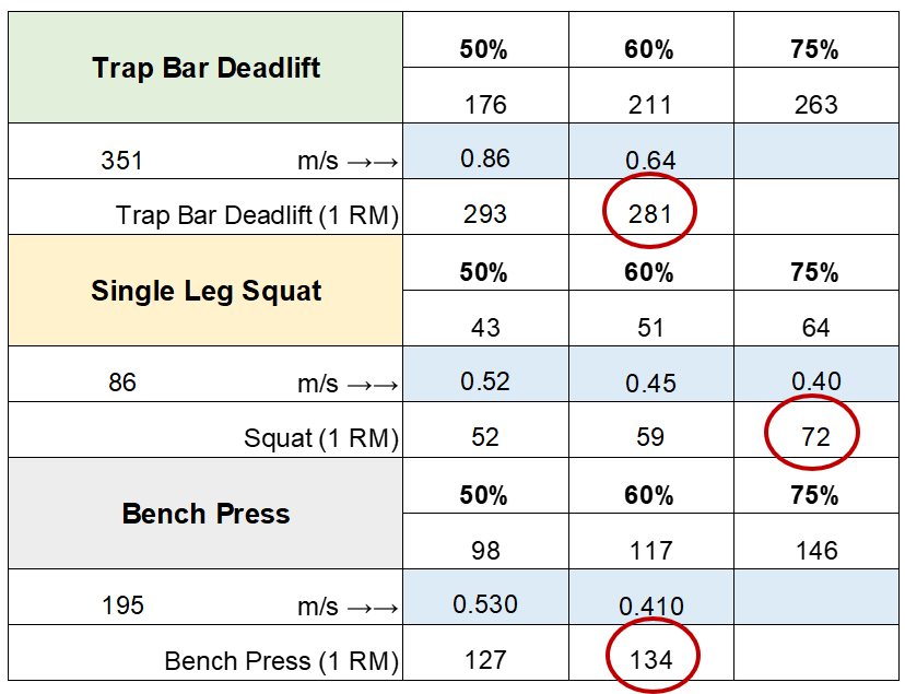 The following is the summary of Jack’s estimated 1RM metrics in the weight room. As you can see, Jack was underneath the sufficient strength margin for both his bilateral and unilateral strength as well as his upper half metrics on the Bench Press.